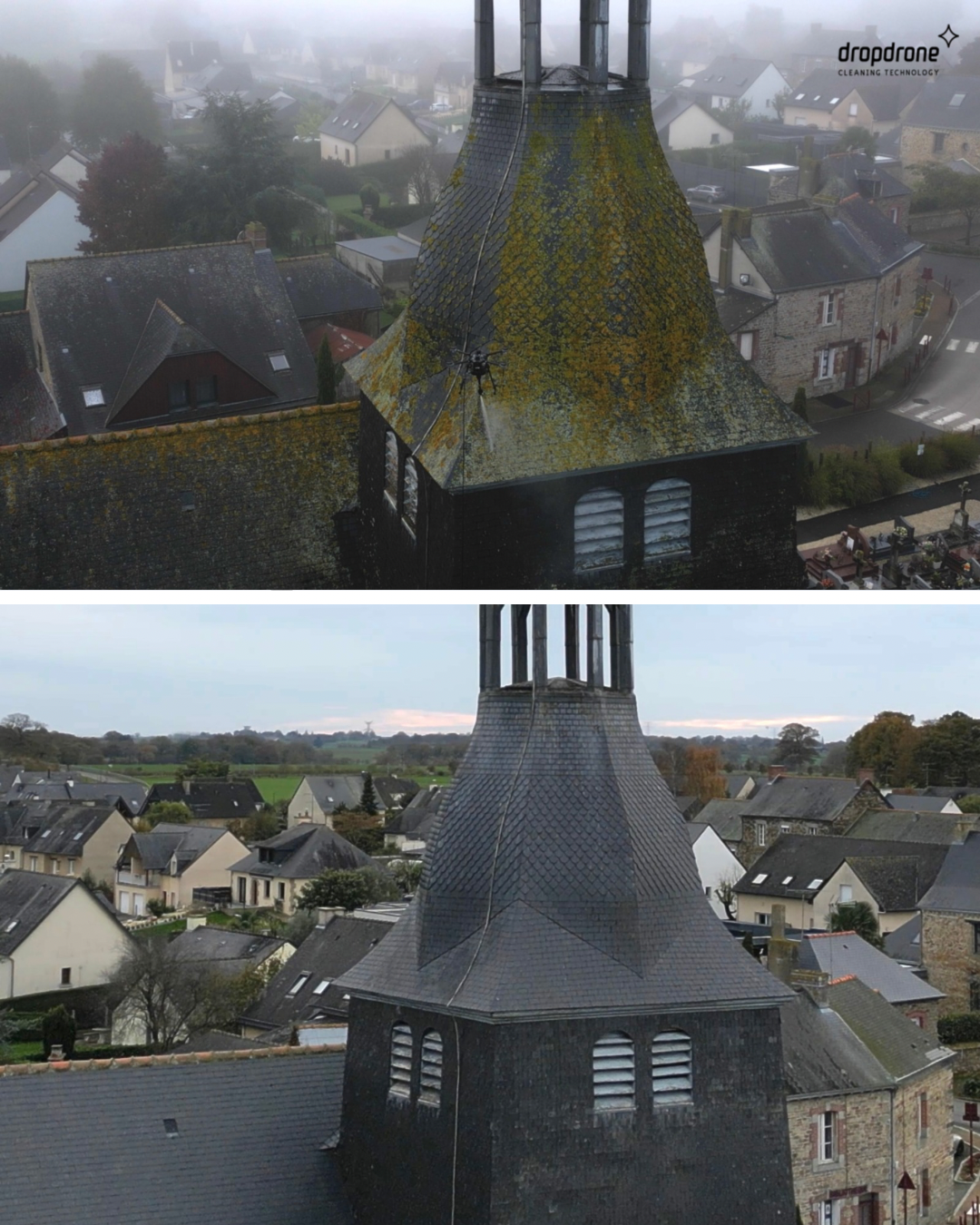 Les toits fortement inclinés sont dangereux à atteindre à pied. Le drone permet d’inspecter et de nettoyer ces surfaces sans risque pour les intervenants.